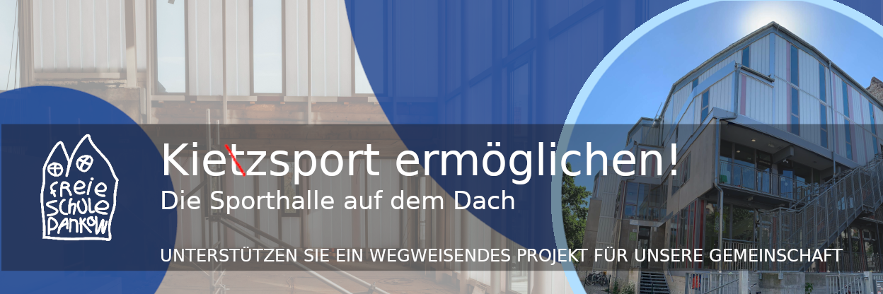Auf dem Dach der Freien Schule Pankow eG soll eine barrierefreie Kiezsporthalle fertiggstellt werden, die nicht nur den Schülern und Schülerinnen der Schule, sondern der gesamten Nachbar*innenschaft zugutekommen soll. Die neue Halle erweitert das knappe Sportangebot in Pankow und bietet dringend benötigte zusätzliche Kapazitäten.